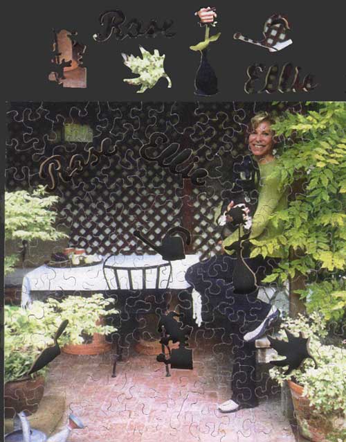 The customer was featured in the Style/Gardens section of the LA Times, and this photo puzzle was ordered to commemorate that. The customer chose the gardening-related figurals. My favorite is the rose, shown in the detail picture with the name pieces. It was placed such that the colors fit the figural - the vase is gray-blue (from her pants), the leaves are green (from her sweater), and the rose is tan, white, and shadowy (from her hand).
