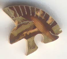 The Roman helmet is intricately fashioned with detail cuts to enhance the figural.