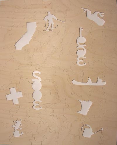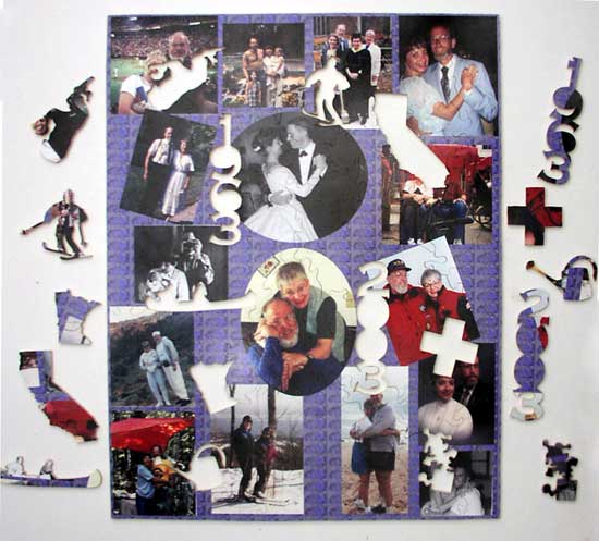 guestbook-style cut 88 pieces 16" x 20" (3.5 square inches per piece) 10 figurals requested by customer (California, Minnesota, Medicine Lake, downhill skier, "1963" and "2003", canoe, first-aid cross, watering can, signature piece) |