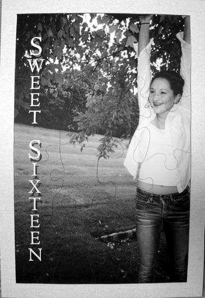 This puzzle was designed to make a sweet sixteen party a little more special. It is meant to be displayed during the party on an easel. The tray holds the pieces together and provides a back-support so it can be set up easily. The party-goers can also write messages on the backs of the pieces.