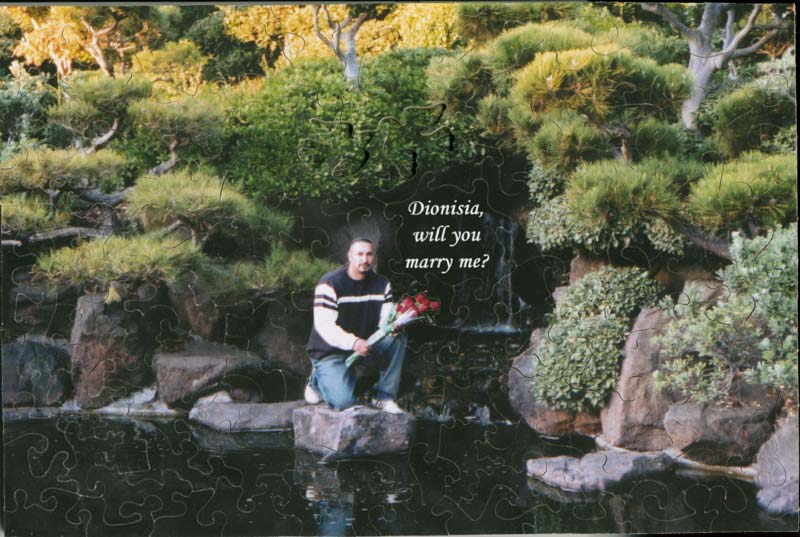The customer sent me two photos to make this puzzle from. One is shown above. The other was the same scene, but without him in it. He wanted that photo (without him) to be printed and included with the box. The piece WITH him would be kept separate, along with the "will you marry me" piece, so that when she assembled the puzzle, she would think it was just a pretty scene and a lovely present.