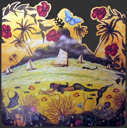 Tropical Paradise is a large puzzle with a Hawaiian theme. It includes Hawaiian butterflies, uses Hawaiian petroglyphs as some of the figurals, and even says Aloha in the center of the puzzle. The top edge is irregular, and the "smoke" coming from the volcano is part of the cut-away. |