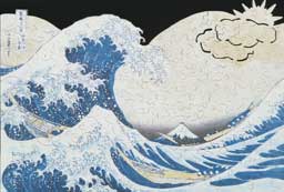 A beautiful oriental painting by the great Hokusai became a delightful puzzle by the ... uhh ... aspiring-to-greatness Jack-in-the-Box Puzzles' Scott Stafford. The sun is formed by the edge-cut and dropped-out clouds obscure the rest. |