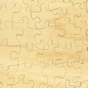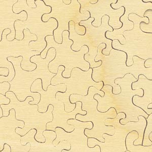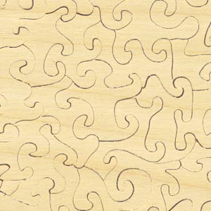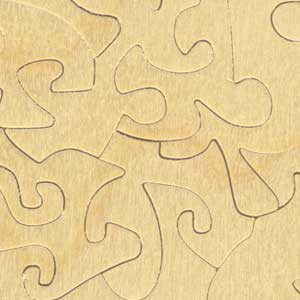 I use one of several styles of pieces in my puzzles. Some of them are described here, but since each puzzle is handcut, sometimes I experiment with different styles. If you have something different in mind for your custom puzzle, I'm open to any suggestions. Generally, a puzzle will only contain one of these styles (mixing styles can make puzzles too easy - a few swirly pieces in an otherwise knobby puzzle will stick out like Waldo on an ice floe), but every piece in every puzzle is unique (there are a few exceptions, of course, like the signature piece, and intentionally double-cut pieces).